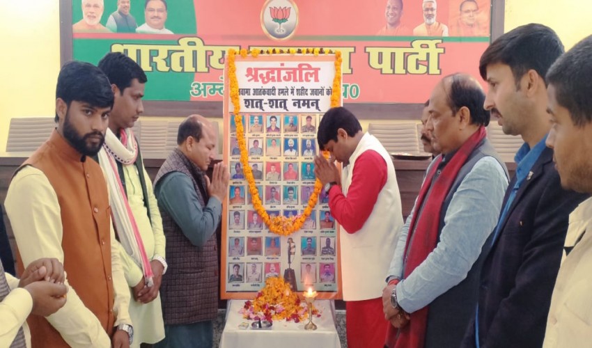 फूलपुर। रविवार को मण्डल कार्यालय भाजपा फूलपुर आजमगढ़ में पुलवामा में शहीद हुए जवानों को पुष्पांजलि अर्पित कर श्रद्धांजलि दी गई। इस मौके पर मण्डल अध्यक्ष भानु प्रताप चौहान, हरिश्चन्द्र श्रीवास...
