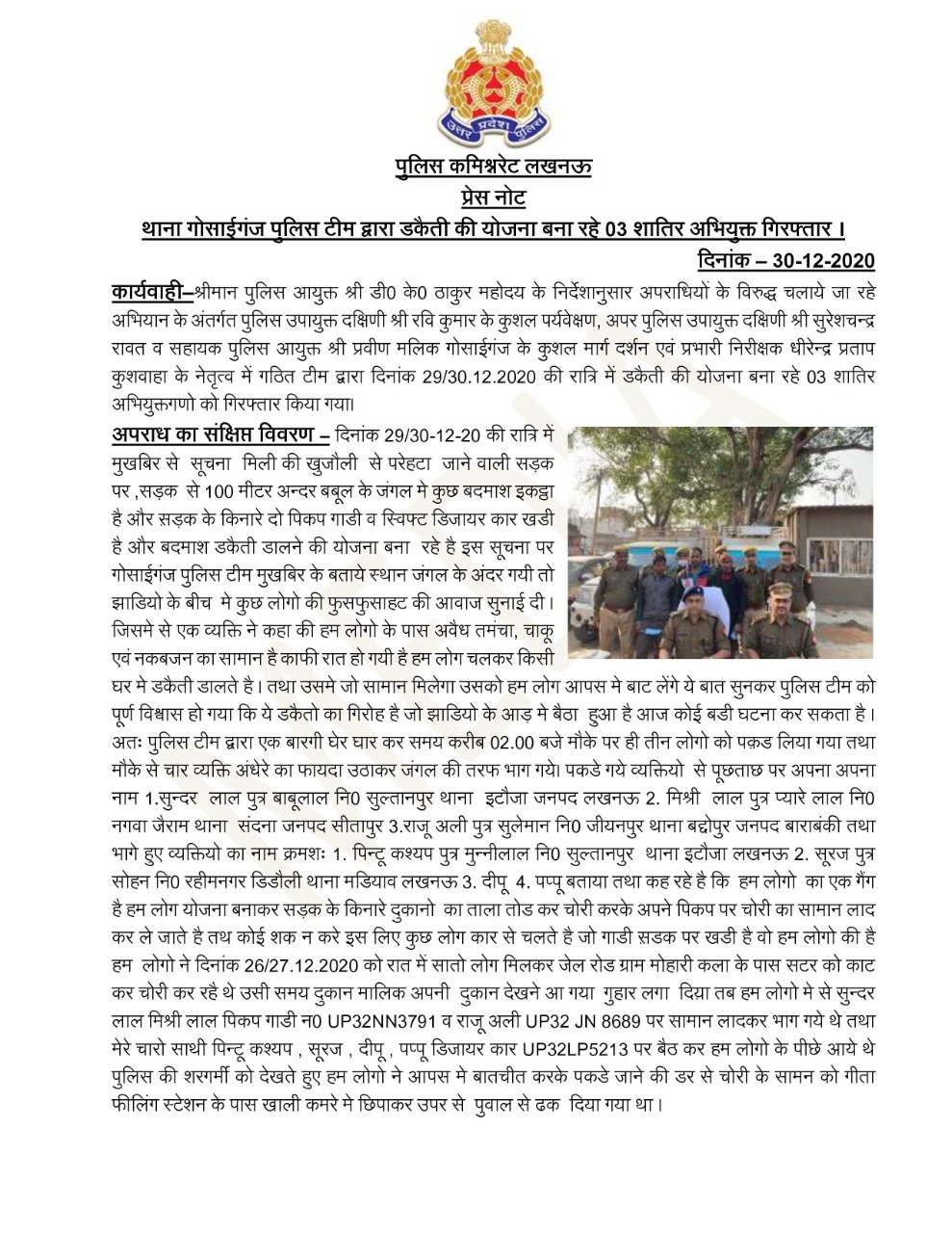 लखनऊ:- पुलिस कमिश्नर डीके ठाकुर के निर्देश पर थाना गोसाईगंज पुलिस टीम को मिली सफलता, डकैती की योजना बना रहे 03 शातिर अभियुक्त गिरफ्तार।