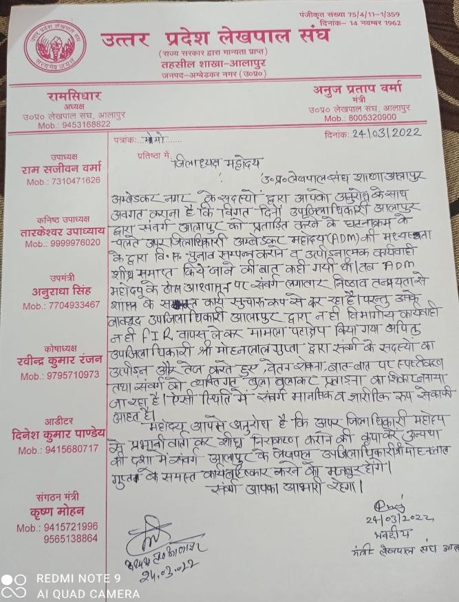 अंबेडकर नगर जिले के आलापुर तहसील में लेखपालों एवं एसडीएम के मध्य कई महीने से छिड़ी रार एवं तकरार उच्च अधिकारियों के हस्तक्षेप के बाद भी थमने का नाम नहीं ले रही है। लेखपाल जहां एसडीएम की कार्यप्रणाली से खफा हैं वहीं एसडीएम द्वारा शासन की योजनाओं का बेहतर तरीके से क्रियान्यवन नहीं करने के कारण उनके विरुद्ध प्रतिकूल प्रविष्टि एवं अन्य कार्यवाही करने का सिलसिला जारी है। एसडीएम मोहनलाल गुप्ता की ओर से लगभग 3 माह पूर्व लेखपाल राम सजीवन वर्मा राम सिधार व एक अन्य लेखपाल के विरुद्ध जहांगीरगंज थाने में विभिन्न धाराओं में मुकदमा पंजीकृत कराया गया था। लेकिन उस मामले में अब तक कोई कार्यवाही नहीं हो पाई थी। इधर सप्ताह भर से लेखपाल फिर आंदोलन की रणनीति बना रहे थे जिसके लिए आलापुर लेखपाल संघ के पदाधिकारियों ने लेखपाल संघ के जिला अध्यक्ष को बाकायदा एक पत्र भी दिया था। तेजी से बदलते घटनाक्रम में कल सोमवार को लेखपाल राम सजीवन वर्मा की पत्नी मिथिलेश वर्मा एवं उसकी मां ने तहसील मुख्यालय में पहुंचकर सनसनी फैला दी लेखपाल राम सजीवन कहीं लापता हो गए हैं। लेखपाल की पत्नी एवं परिजनों तथा लेखपालों द्वारा सोमवार को तहसील में हंगामा किए जाने के बाद लेखपाल की पत्नी मिथिलेश वर्मा ने एसडीएम पर तमाम गंभीर आरोप लगाते हुए सनसनी फैला दी। तहसील में हंगामे की सूचना के बाद क्षेत्राधिकारी आलापुर के अलावा जहांगीरगंज एवं आलापुर थाने की फोर्स भी तहसील में पहुंच गई जिसके बाद लेखपाल राम सजीवन वर्मा की पत्नी ने जहांगीरगंज पुलिस को एसडीएम व एक अन्य कर्मी के विरुद्ध मुकदमा पंजीकृत करने के लिए तहरीर दिया। बाद में उसने देर शाम क्षेत्राधिकारी आलापुर से भी मुलाकात कर उन्हें भी प्रार्थना पत्र सौंपा तथा कार्यवाही की मांग किया। क्षेत्राधिकारी आलापुर द्वारा जहांगीरगंज थानाध्यक्ष को कार्यवाही के लिए निर्देशित किया गया लेकिन अभी तक मुकदमा नहीं पंजीकृत हो पाया । विडंबना है कि अभी तक लापता लेखपाल राम सजीवन वर्मा का 24 घंटे बाद भी कोई सुराग नहीं लग पाया है। मामला जन चर्चा का विषय बना हुआ है।